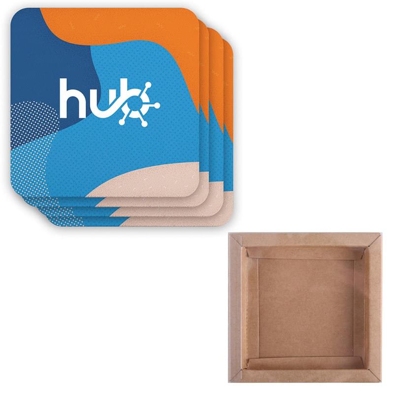 Set comes with four recycled square dye sub coasters. Coasters are made with absorbent recycled materials. Rubber base keeps surfaces protected and scratch-free. Set comes packaged in a kraft box with a clear window.