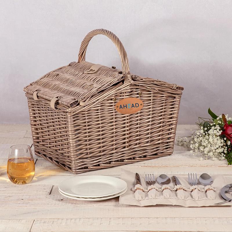 Double-lid basket with service for two. Includes roll-up flatware pouch. Made of willow with polyester lining. Includes, flatware roll with flatware sets for two, corkscrew, two wine glasses, two plates