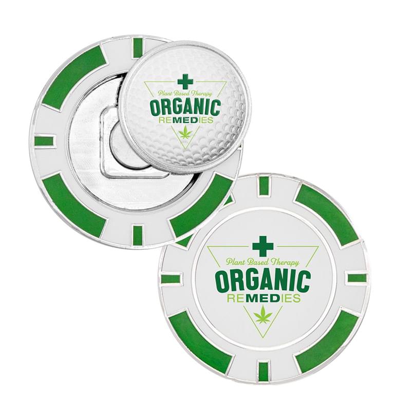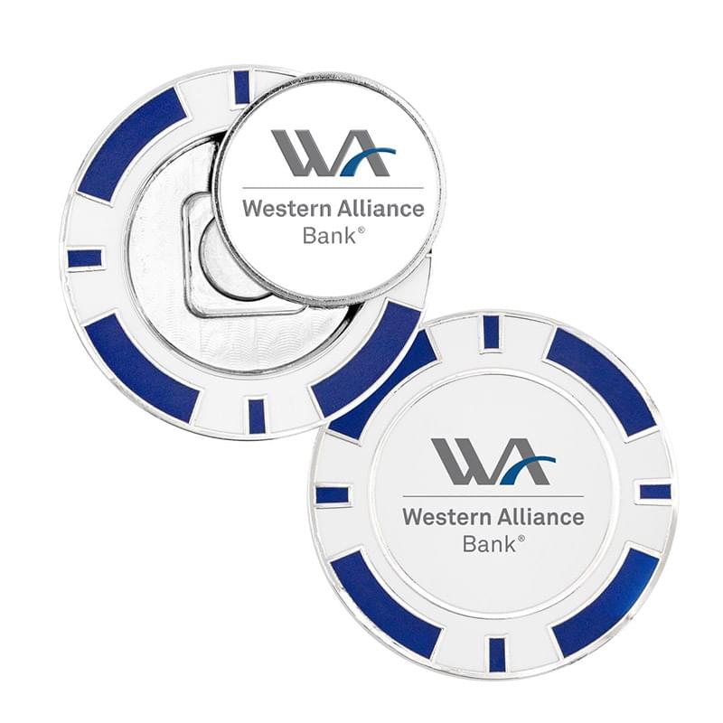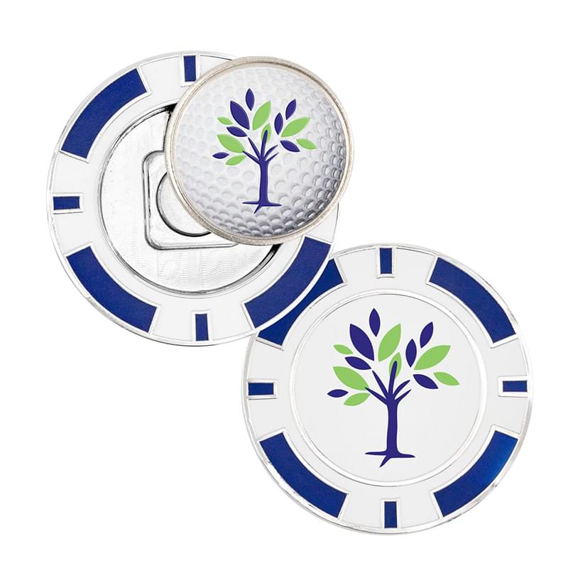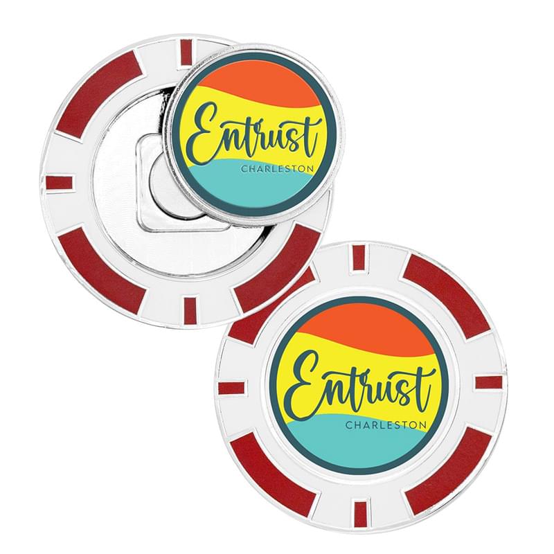 This metal poker chip coin is a sure bet for your next golf tournament giveaway. Crafted from extra thick 5mm zinc alloy, coins feature a shiny nickel finish with smooth resin enamel color fill for quality you can see and feel. The magnetic base holds most standard 1" golf ball markers. Pricing includes a removable golf ball marker with 3D Texture Print and the same logo digitally printed on the back of the poker chip. Perfect for golf event sponsors or pro shops branding. Fast 8 working day production standard on catalog quantities.