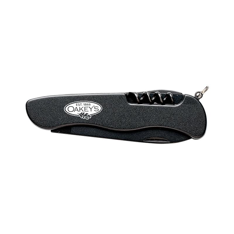 Sleek all black 4.3"L aluminum handle, and 3.2" stainless-steel blade. Features 5 tools: Knife, Can opener, bottle opener, Corkscrew, flathead screwdriver, puncher. Laser engraved. Boxed.
