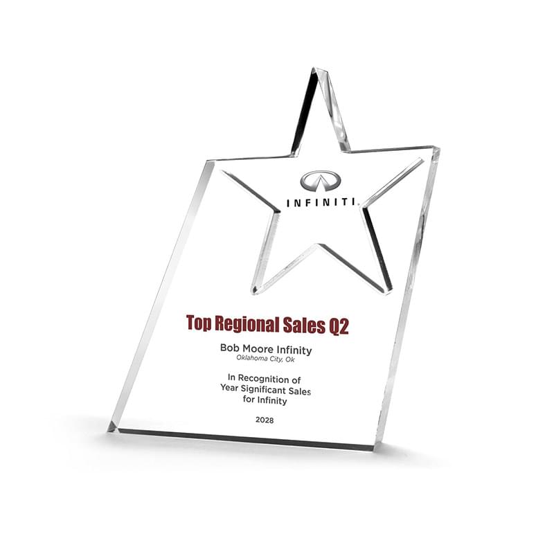 This elegant star-shaped clear acrylic award features a carved star at the top and a freestanding base. Customize it with laser engraving or Digi-color printing.